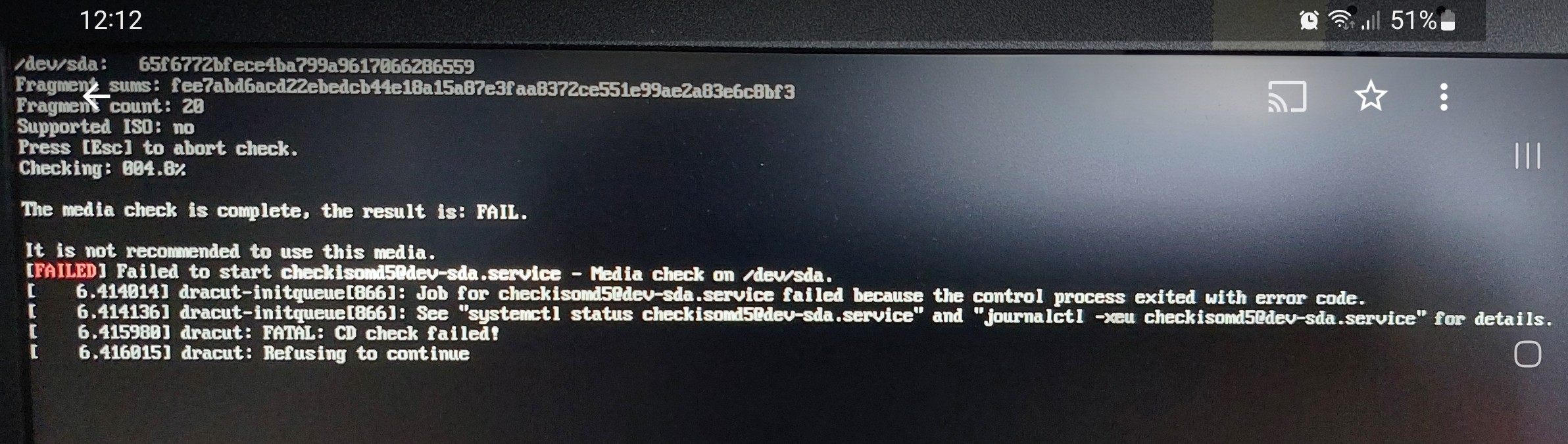 I used Fedora Media Writer on Windows 10 UK downloaded from this site to make a drive with Workstation 38. The writer software says it was successful, but when I try to boot from it, it fails the media check. I tried on a kioxia stick then a few day later with a Kingston stick and both are successful in the media writer but both fail in the same way when I try to boot from them. Also when it fails the only way to do anything is to hold the power button down.