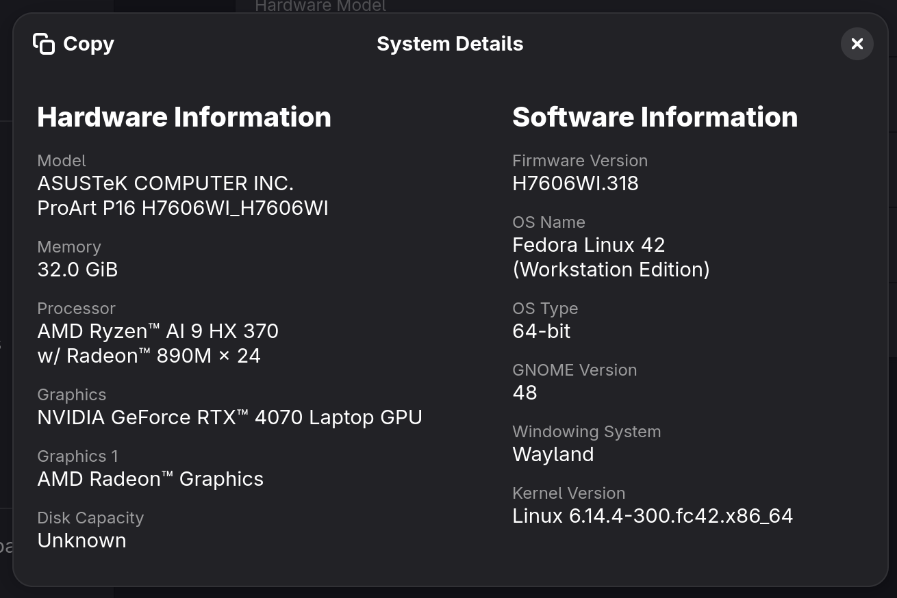 I just installed Fedora 42 on my Asus ProArt P16 H7606WI. When installed everything was fine, but after the system updates, i have EXACTLY the same issue.