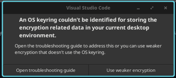[314774:0707/210405.158116:INFO:CONSOLE(627)] "%cTRACE color: #888 DialogService#prompt An OS keyring couldn't be identified for storing the encryption related data in your current desktop environment.", source: vscode-file://vscode-app/opt/visual-studio-code-insiders/resources/app/out/vs/workbench/workbench.desktop.main.js (627)