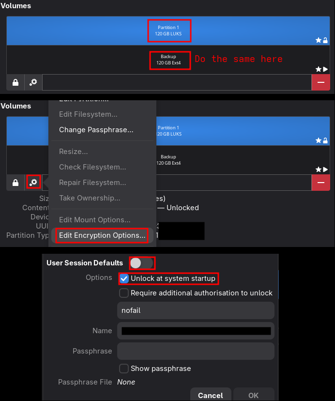 This is not an automated method, but only requires running two commands per-drive (and is easy to understand) — in addition to typing the disk passphrase and the user account password. Can be saved as an .sh script, add any drives you’d like: