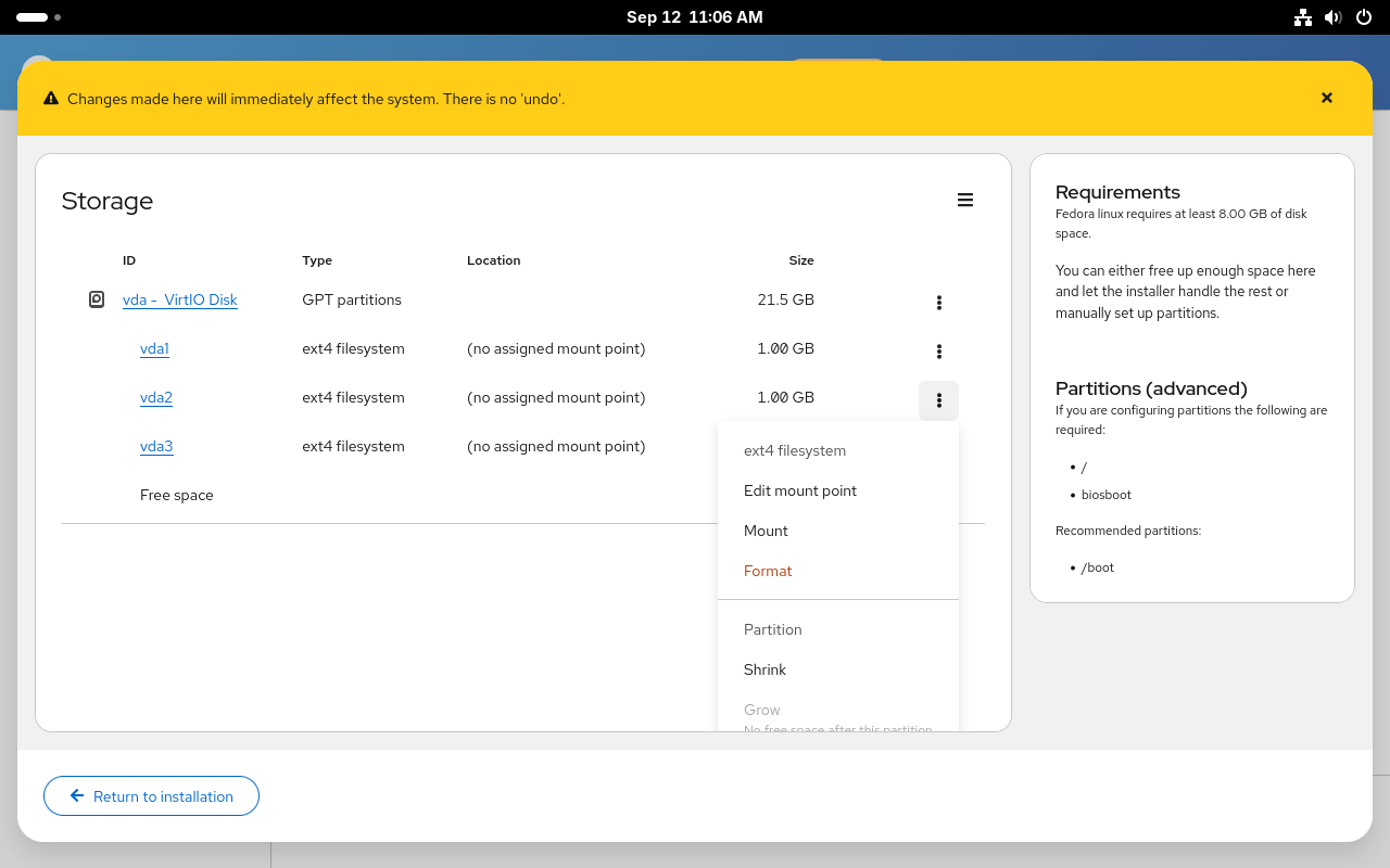 If you run the installer on a Fedora 43 Beta desktop and go to the advanced storage editor available through a three-dots menu, you might see some dialogs cropped over when configuring disk partitions. Here’s an example (the Delete menu item, located at the very bottom of the menu, is not visible at all):
