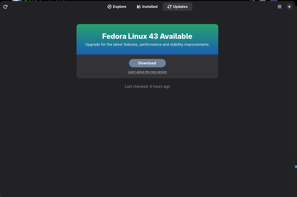Hey, currently i am on fedora 42. And I have full of dependencies downloaded in my system. When i opened the flatpack software for updates it is showing me the newest version of fedora 43. Which i can download from there. So i had a question regarding that. If i can download 43 version from there, then will it effect my system configuration or downloaded software and libraries and dependencies?