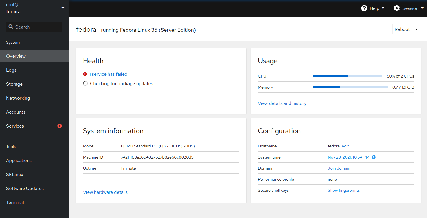 When I go on Chrome on my Windows 7 PC and login with the IP address (because typing https://fedora:9090 doesn’t work for me), I get to the login window and I can login successfully with the administrator name and password I set up with adminstrator privileges.