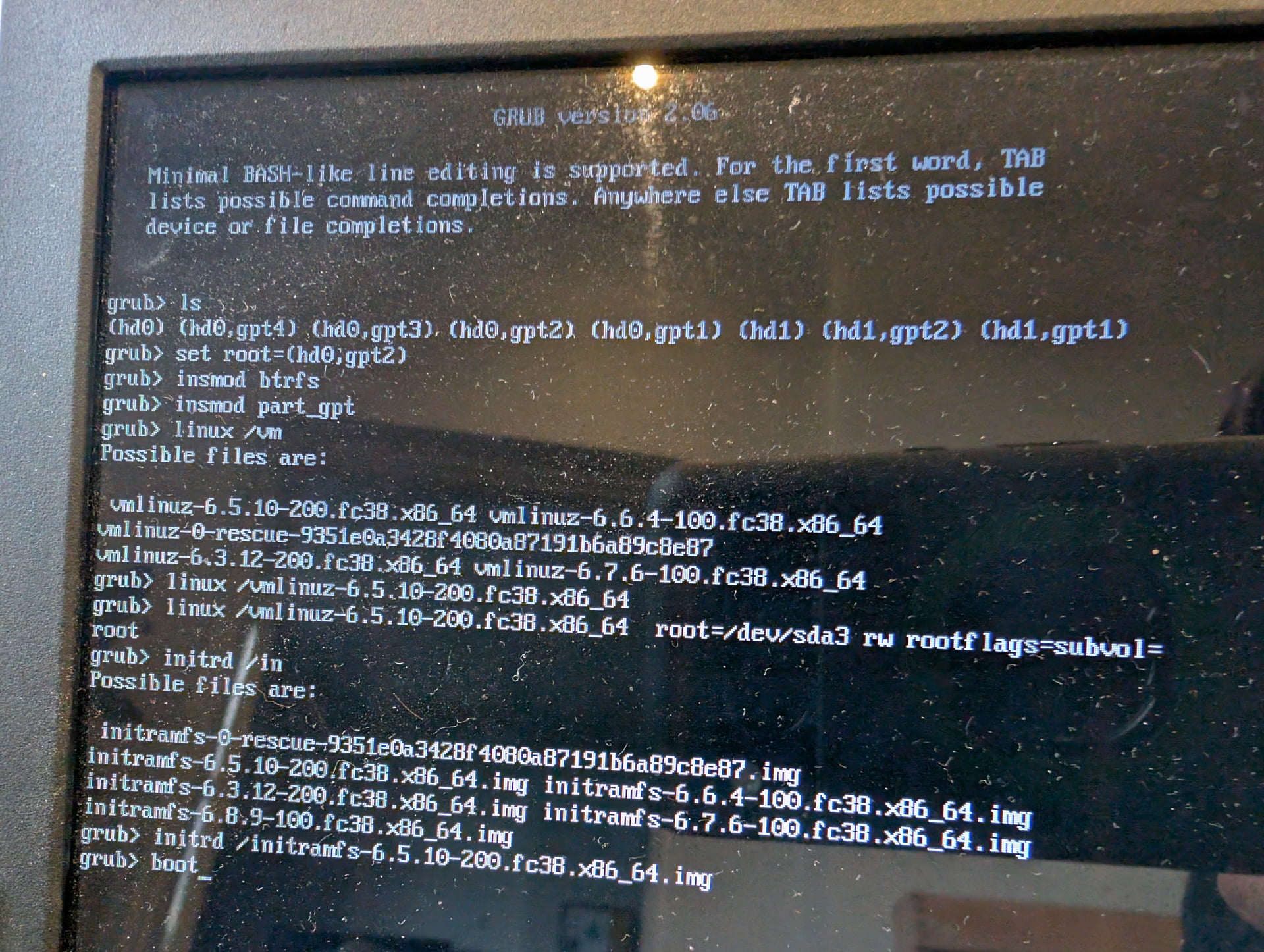 However, I am unable to boot into my system and am just dropped at the grub command line when booting off my drive. If I manually try and boot into my drive using the grub command line as below