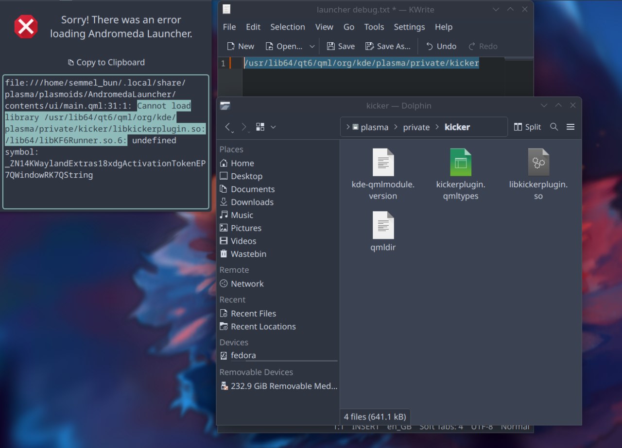 file:///home/semmel_bun/.local/share/plasma/plasmoids/AndromedaLauncher/contents/ui/main.qml:31:1: Cannot load library /usr/lib64/qt6/qml/org/kde/plasma/private/kicker/libkickerplugin.so: /lib64/libKF6Runner.so.6: undefined symbol: _ZN14KWaylandExtras18xdgActivationTokenEP7QWindowRK7QString